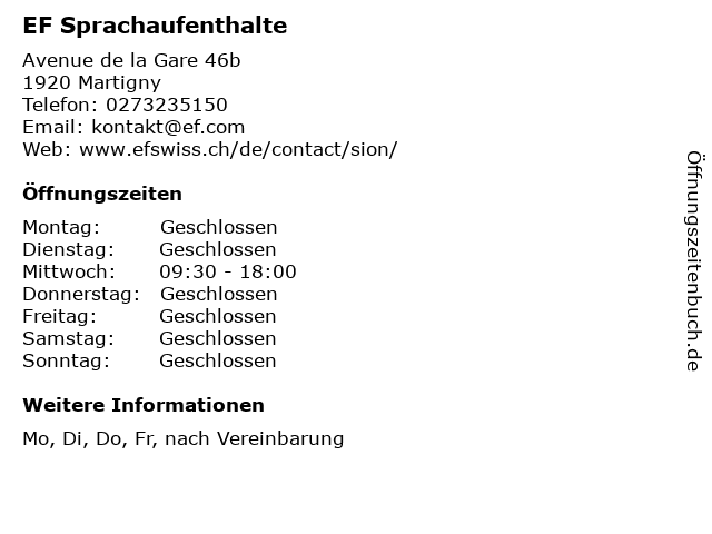 | Öffnungszeiten EF Sprachaufenthalte in Martigny anzeigen | |