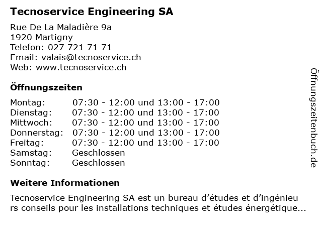 | Öffnungszeiten Tecnoservice Engineering SA in Martigny anzeigen | |