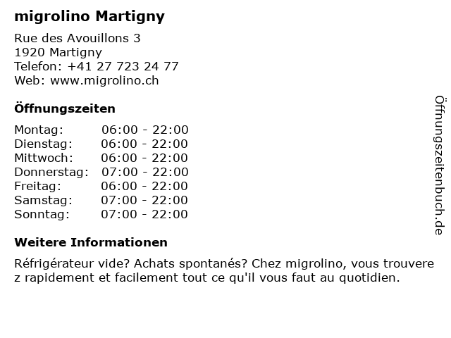 | Öffnungszeiten migrolino Martigny in Martigny anzeigen | |