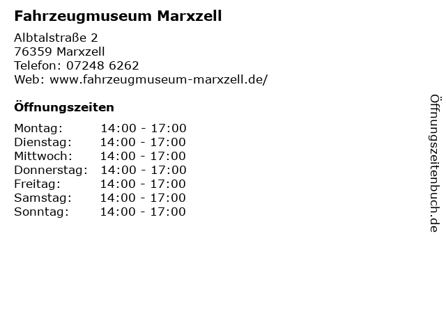 | Öffnungszeiten Fahrzeugmuseum Marxzell in Marxzell anzeigen | |