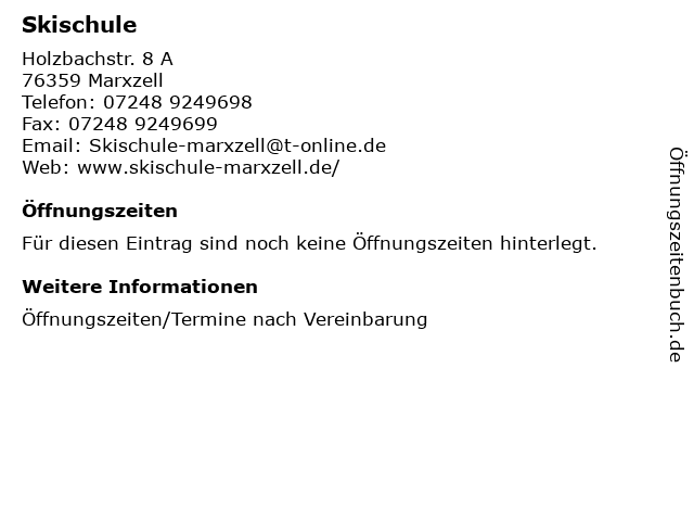 | Öffnungszeiten Skischule in Marxzell anzeigen | |