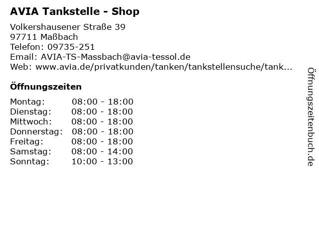 | Öffnungszeiten AVIA Tankstelle - Shop in Maßbach anzeigen | |