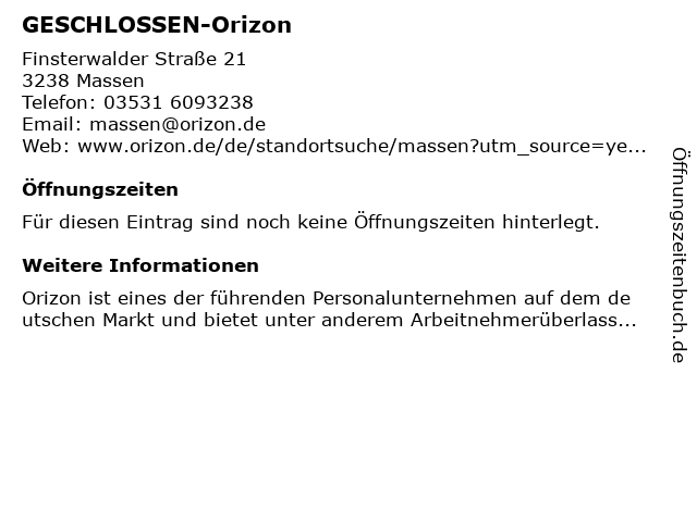 Öffnungszeiten GESCHLOSSEN-Orizon in Massen anzeigen | |