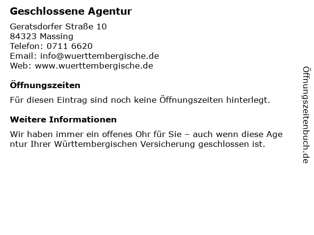 | Öffnungszeiten Geschlossene Agentur in Massing anzeigen | |