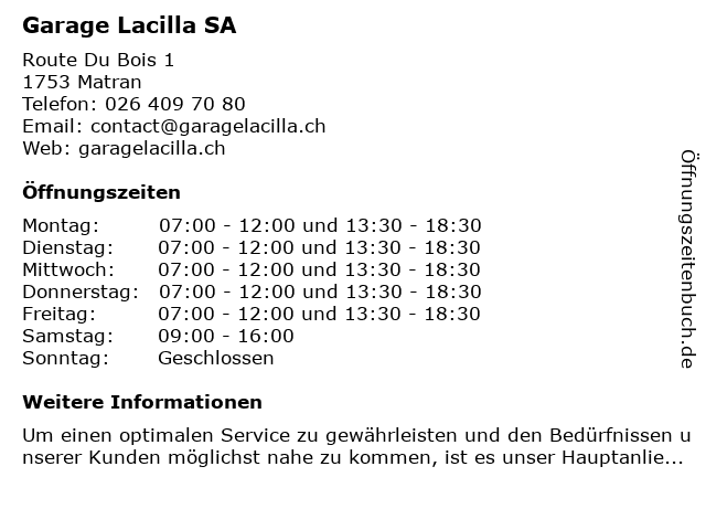 | Öffnungszeiten Garage Lacilla SA in Matran anzeigen | |