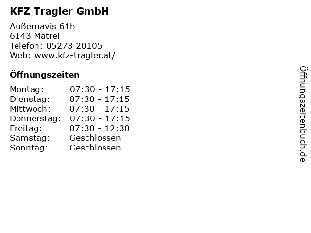 | Öffnungszeiten KFZ Tragler GmbH in Matrei anzeigen | |