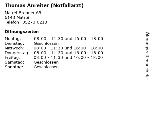 Branchen & Suchbegriffe zu Thomas Anreiter (Notfallarzt):anreiter, arztpraxis, notfallarzt, sprechzeiten, thomas  |