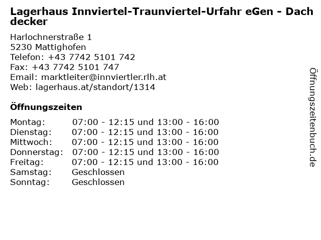 1 Innviertler Lagerhausgenossenschaft eGen - Agrar und Brennstoffe (Entfernung: 0,00 km) Harlochnerstraße 1, 5230 Mattighofen 2 Lagerhaus Innviertel-Traunviertel-Urfahr eGen - Baustoffe (Entfernung: 0,00 km) Harlochnerstraße 1, 5230 Mattighofen 3 Lagerhaus Innviertel-Traunviertel-Urfahr eGen - Werkstätte Landmaschinen (Entfernung: 0,38 km) Unterlochnerstraße 2a, 5230 Mattighofen 4 Innviertler Lagerhausgenossenschaft eGen - Agrar, Bau & Garten, Baustoffe, Brennstoffe und Fachhandel (Entfernung: 11,81 km) Gundertshausen 48, 5142 Eggelsberg 5 Innviertler Lagerhausgenossenschaft eGen - Werkstätte Landmaschinen (Entfernung: 11,81 km) Gundertshausen 48, 5142 Eggelsberg 6 Innviertler Lagerhausgenossenschaft eGen - Ersatzteile (Entfernung: 11,81 km) Gundertshausen 48, 5142 Eggelsberg |
