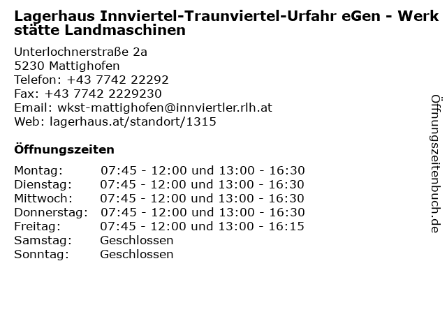 1 Lagerhaus Innviertel-Traunviertel-Urfahr eGen - Landmaschinen-Handel (Entfernung: 0,14 km) Unterlochnerstraße 2a, 5230 Mattighofen 2 Innviertler Lagerhausgenossenschaft eGen - Agrar und Brennstoffe (Entfernung: 0,38 km) Harlochnerstraße 1, 5230 Mattighofen 3 Lagerhaus Innviertel-Traunviertel-Urfahr eGen - Dachdecker (Entfernung: 0,38 km) Harlochnerstraße 1, 5230 Mattighofen 4 Lagerhaus Innviertel-Traunviertel-Urfahr eGen - Baustoffe (Entfernung: 0,38 km) Harlochnerstraße 1, 5230 Mattighofen 5 Innviertler Lagerhausgenossenschaft eGen - Agrar, Bau & Garten, Baustoffe, Brennstoffe und Fachhandel (Entfernung: 11,54 km) Gundertshausen 48, 5142 Eggelsberg 6 Innviertler Lagerhausgenossenschaft eGen - Werkstätte Landmaschinen (Entfernung: 11,54 km) Gundertshausen 48, 5142 Eggelsberg |