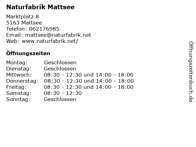 | Öffnungszeiten Naturfabrik Mattsee in Mattsee anzeigen | |