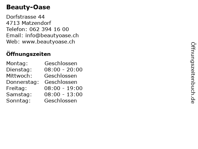 | Öffnungszeiten Beauty-Oase in Matzendorf anzeigen | |