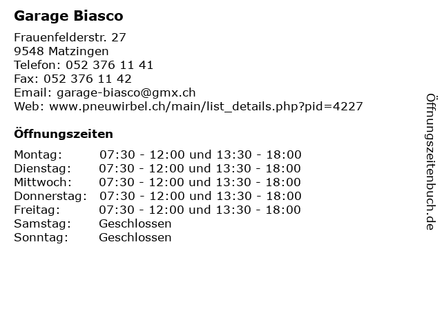 | Öffnungszeiten Garage Biasco in Matzingen anzeigen | |