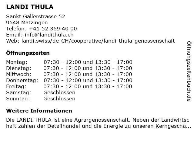 | Öffnungszeiten LANDI THULA in Matzingen anzeigen | |