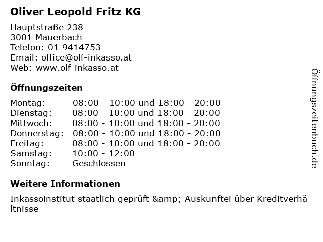 | Öffnungszeiten Oliver Leopold Fritz KG in Mauerbach anzeigen | |
