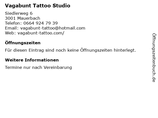| Öffnungszeiten Vagabunt Tattoo Studio in Mauerbach anzeigen | |