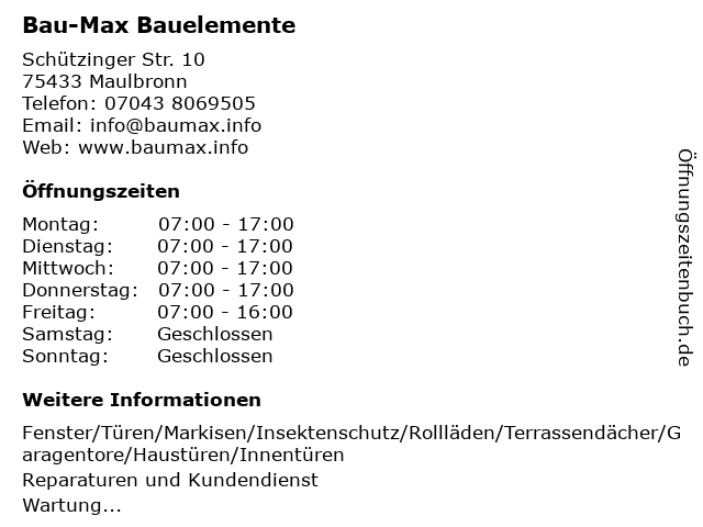 | Öffnungszeiten Bau-Max Bauelemente in Maulbronn anzeigen | |