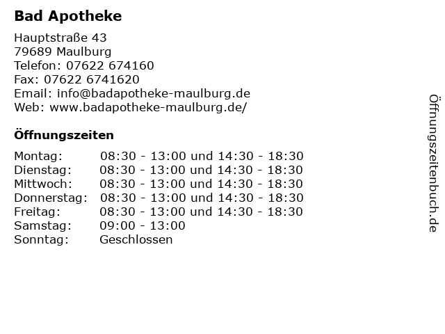 | Öffnungszeiten Bad Apotheke in Maulburg anzeigen | |