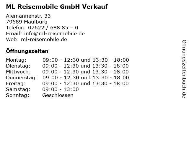 Branchen & Suchbegriffe zu ML Reisemobile GmbH Verkauf:gasprüfungen, ml, reisemobile, service, verkauf, wohnmobile, zubehör |