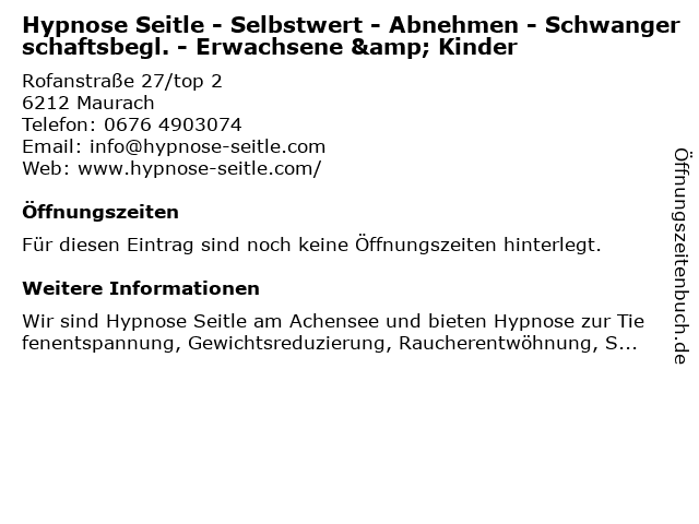 | Hypnose Seitle - Selbstwert - Abnehmen - Schwangerschaftsbegl. - Erwachsene & Kinder anrufen | |