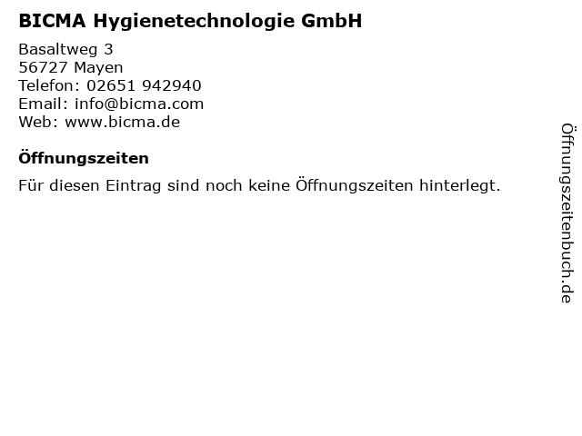 | Öffnungszeiten BICMA Hygienetechnologie GmbH in Mayen anzeigen | |