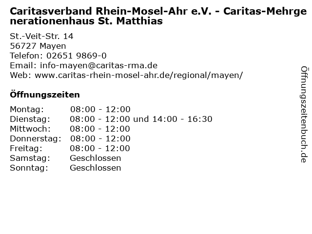 4 Schuldner- und Insolvenzberatung der Caritas (Offene Sprechzeiten) (Entfernung: 0,02 km) St.-Veit-Str. 14, 56727 Mayen 5 Caritasverband für die Region Rhein-Mosel-Ahr e.V., Cari-Laden, Villa Villakulla (Entfernung: 0,29 km) Neustr. 22, 56727 Mayen 6 |