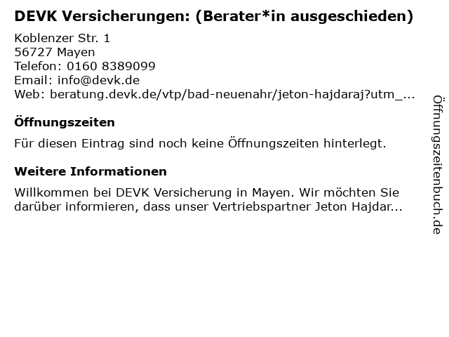 1 DEVK Versicherung Marc Weiler Bereichsverkaufsleiter (Entfernung: 0,00 km) Koblenzer Straße 1, 56727 Mayen 4 Unternehmensberatung Gerhard Franke Consult Berater u. Trainer f. Management u. Controlling (Entfernung: 16,90 km) Hauptstr. 83, 56332 Wolken 6 |