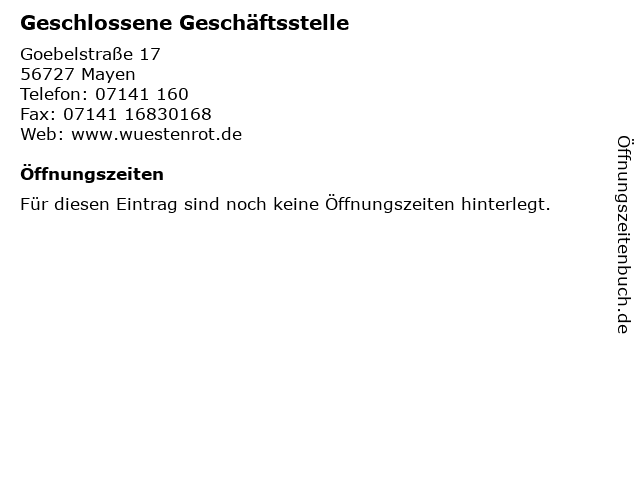 | Telefonnummer Geschlossene Geschäftsstelle in Mayen (07141 160) anrufen | |