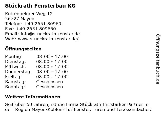 | Öffnungszeiten Stückrath Fensterbau KG in Mayen anzeigen | |