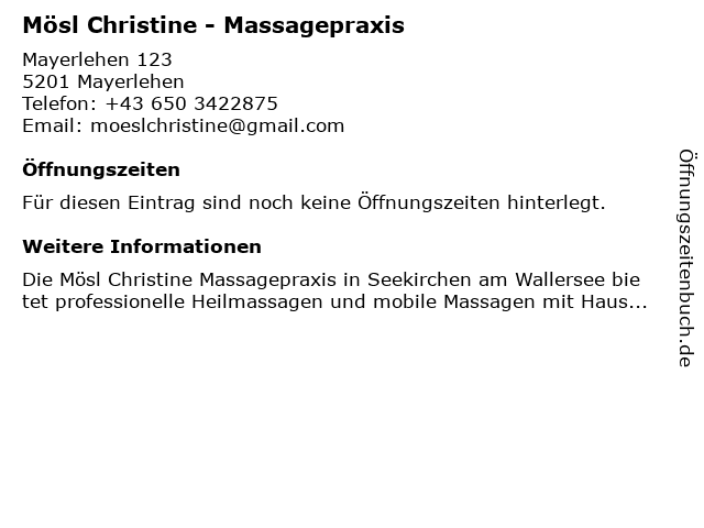 4 Niederwieser Christa Massagepraxis (Entfernung: 2,48 km) Sonnensiedlung 23, 5201 Seekirchen am Wallersee 6  |