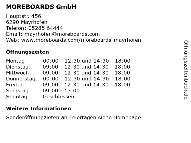 | Öffnungszeiten MOREBOARDS GmbH in Mayrhofen anzeigen | |