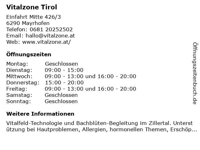 | Öffnungszeiten Vitalzone Tirol in Mayrhofen anzeigen | |
