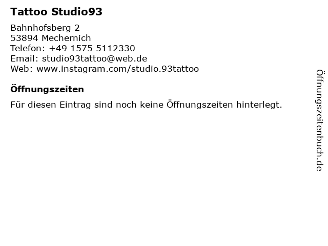 | Öffnungszeiten Tattoo Studio93 in Mechernich anzeigen | |