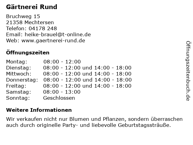 | Öffnungszeiten Gärtnerei Rund in Mechtersen anzeigen | |