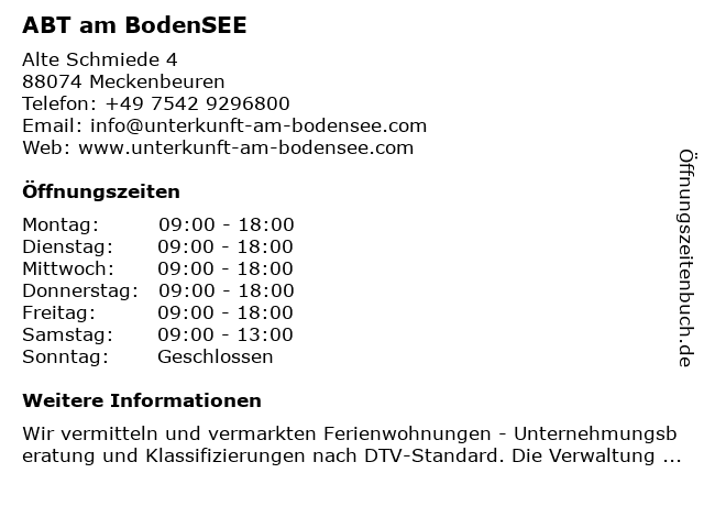 | Öffnungszeiten ABT am BodenSEE in Meckenbeuren anzeigen | |