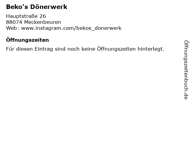 | Öffnungszeiten Beko's Dönerwerk in Meckenbeuren anzeigen | |