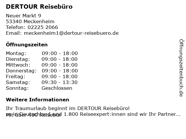 | Öffnungszeiten DERTOUR Reisebüro in Meckenheim anzeigen | |