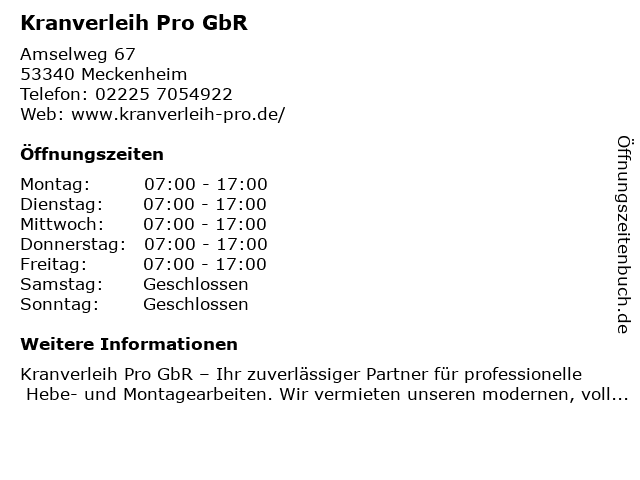 | Öffnungszeiten Kranverleih Pro GbR in Meckenheim anzeigen | |