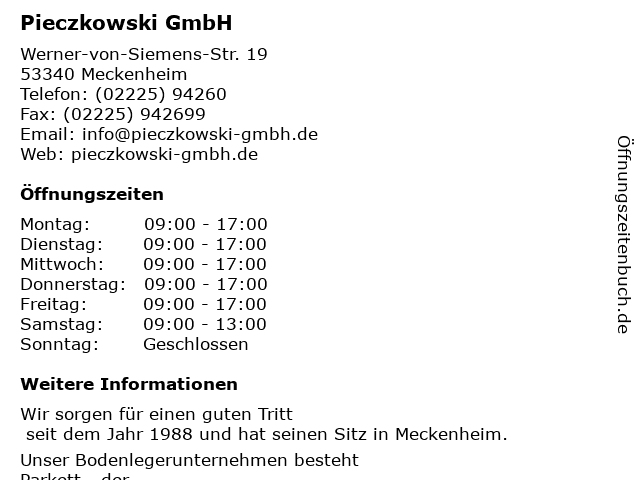 | Öffnungszeiten Pieczkowski GmbH in Meckenheim anzeigen | |