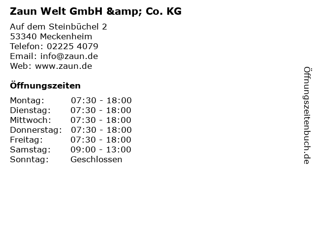 | Öffnungszeiten Zaun Welt GmbH & Co. KG in Meckenheim anzeigen | |
