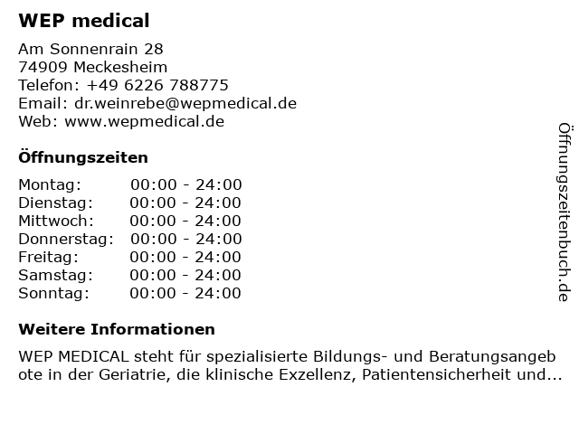 | Öffnungszeiten WEP medical in Meckesheim anzeigen | |