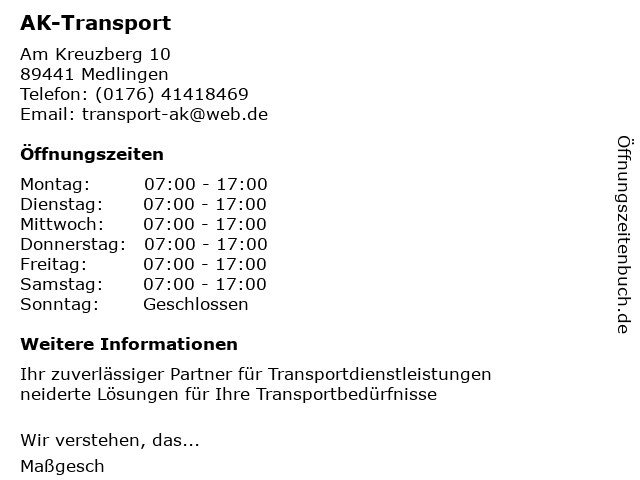 | Öffnungszeiten AK-Transport in Medlingen anzeigen | |