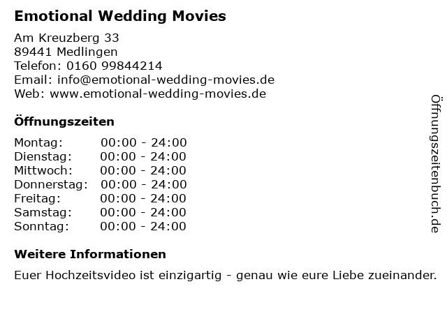 | Öffnungszeiten Emotional Wedding Movies in Medlingen anzeigen | |
