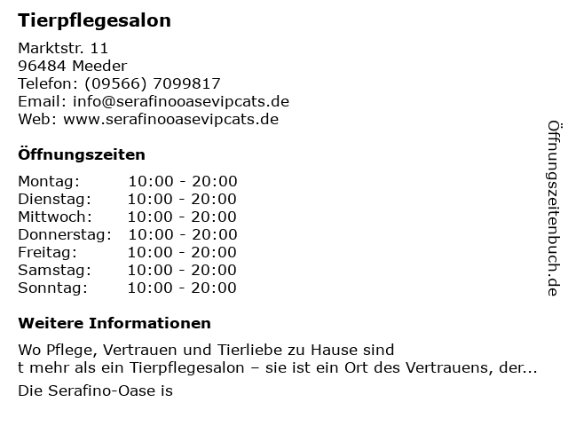 | Öffnungszeiten Tierpflegesalon in Meeder anzeigen | |