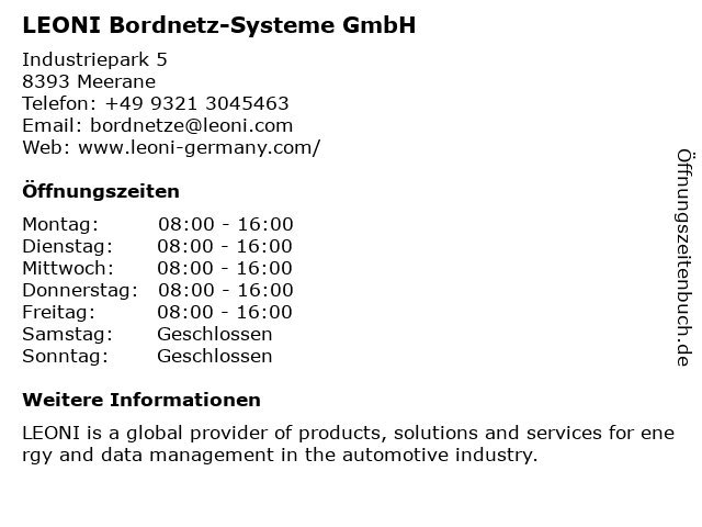 | Öffnungszeiten LEONI Bordnetz-Systeme GmbH in Meerane anzeigen | |