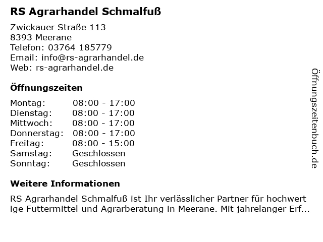 | Öffnungszeiten RS Agrarhandel Schmalfuß in Meerane anzeigen | |