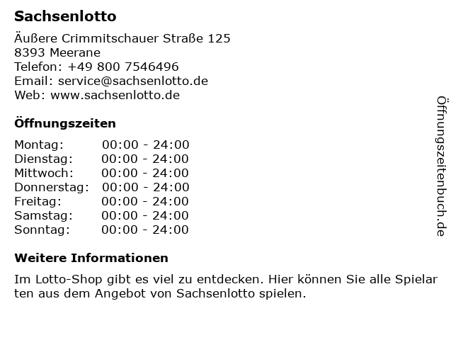 | Öffnungszeiten Sachsenlotto in Meerane anzeigen | |