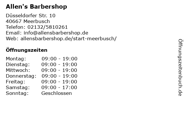 | Öffnungszeiten Allen's Barbershop in Meerbusch anzeigen | |