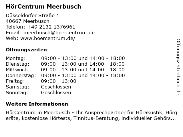 | Öffnungszeiten HörCentrum Meerbusch in Meerbusch anzeigen | |