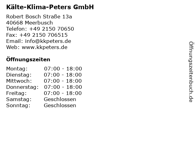 | Öffnungszeiten Kälte-Klima-Peters GmbH in Meerbusch anzeigen | |