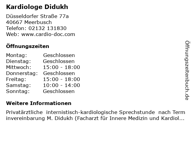 | Öffnungszeiten Kardiologe Didukh in Meerbusch anzeigen | |